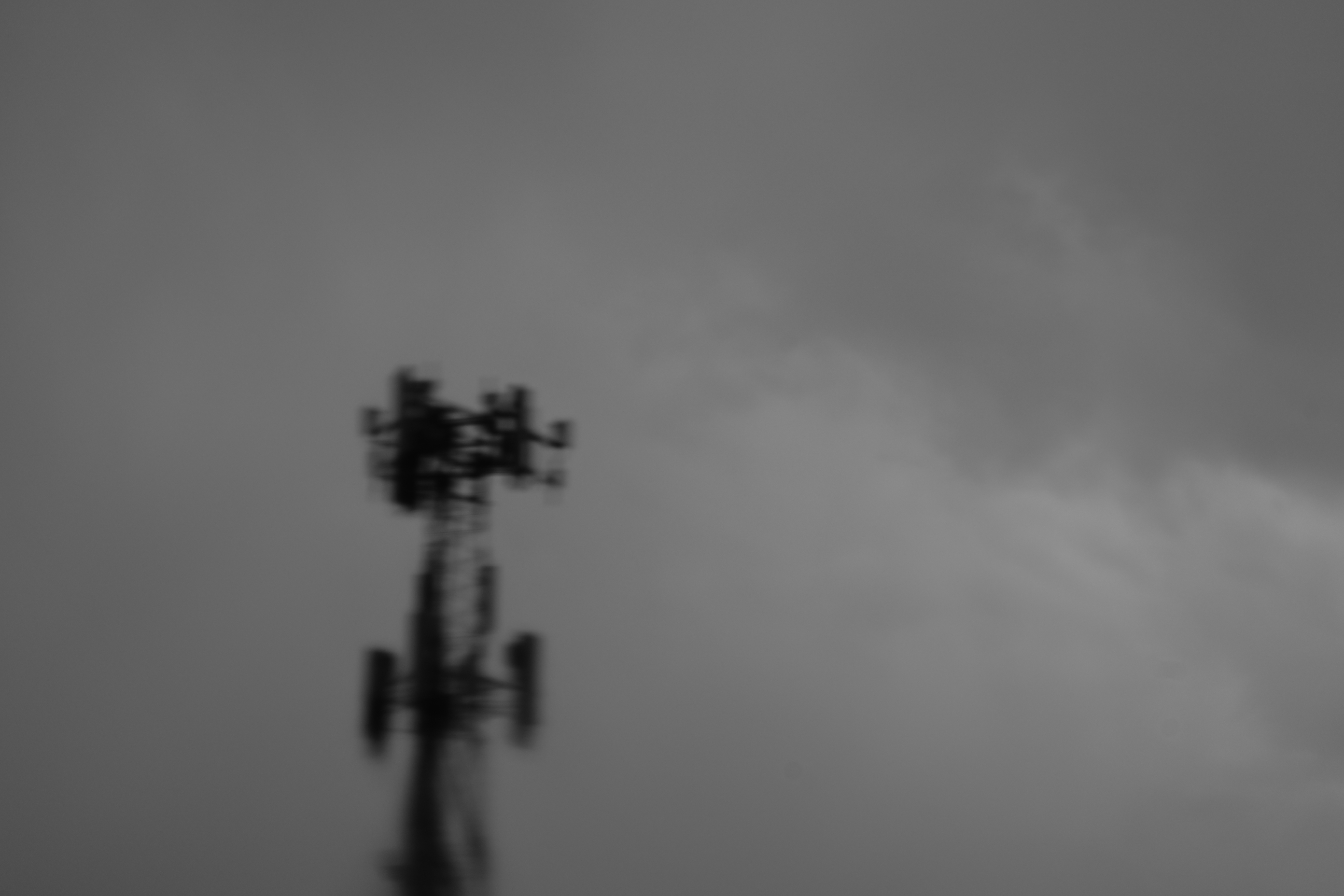 black and white photo of a leaf frond lying partially submerged in a sandy puddle black and white photo of a cow standing in a field with two hills behind it black and white photo of a blurred pond with hazy tree branches black and white photo of a hilly horizon with an old oil well in the middle distance grainy black and white photo of a mountain range and a barn blurry black and white photo of a grainery, with the towers extending through blurred streaks to the top of the frame